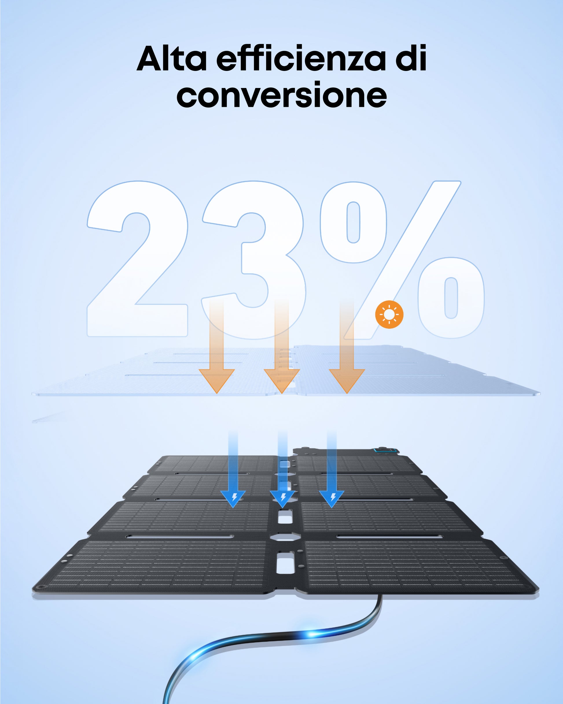 Fino al 23% di efficienza di conversione: le celle solari altamente efficienti producono più energia dalla luce solare per una ricarica più rapida.