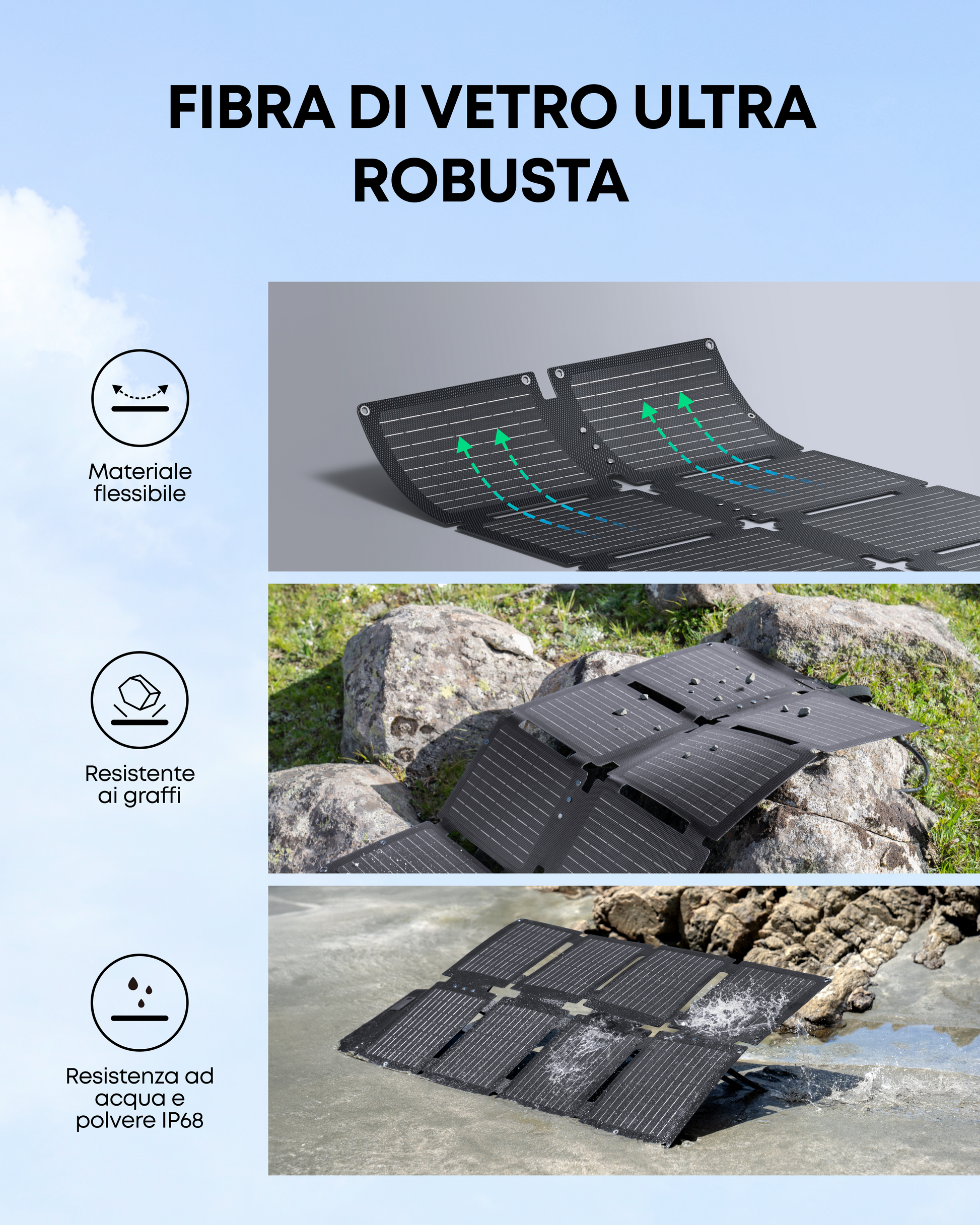 Impermeabile e antipolvere IP68: il pannello PS60 resiste a pioggia, polvere e spruzzi esterni, per avere sempre una fonte di energia affidabile.