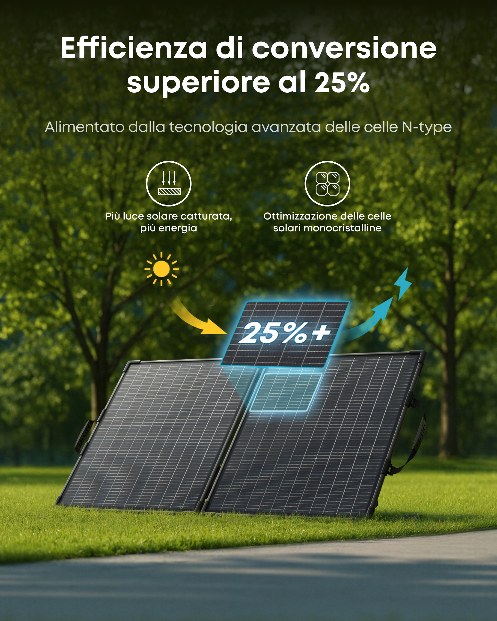 Efficienza di conversione superiore al 25% con celle solari di nuova generazione: realizzato con celle solari N-type avanzate che riducono la perdita di energia e mantengono alte prestazioni anche ad alte temperature, fornendo più potenza, più rapidamente, anche in condizioni difficili.